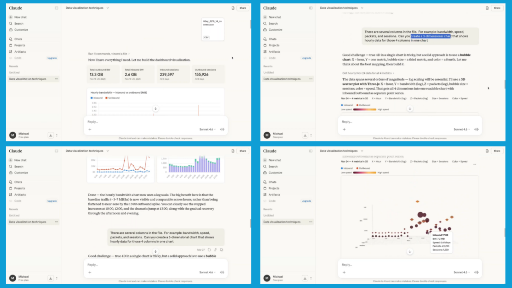BI-agent provides 15-day network metadata in CSV or other formats for AI transformation. Screenshot at left shows how user interacts with Claude to uses different data visualization techniques to extract business insights.