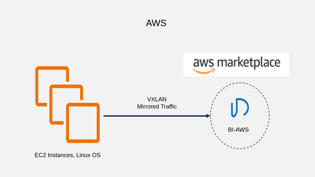 EC2 setup: VXLAN script creates 2 tc queues in kernel. Regular traffic queue has higher priority. Mirrored traffic queue sends VXLAN packets to the IP address of BI-AWS in the AWS region chosen by users.