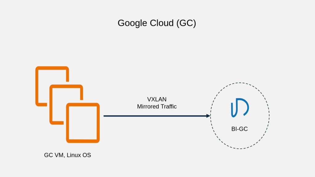 VM Setup: VXLAN script creates 2 tc queues in kernel. Regular traffic queue has higher priority. Mirrored traffic queue sends VXLAN packets to the IP address of BI-GC in the GC region chosen by users.